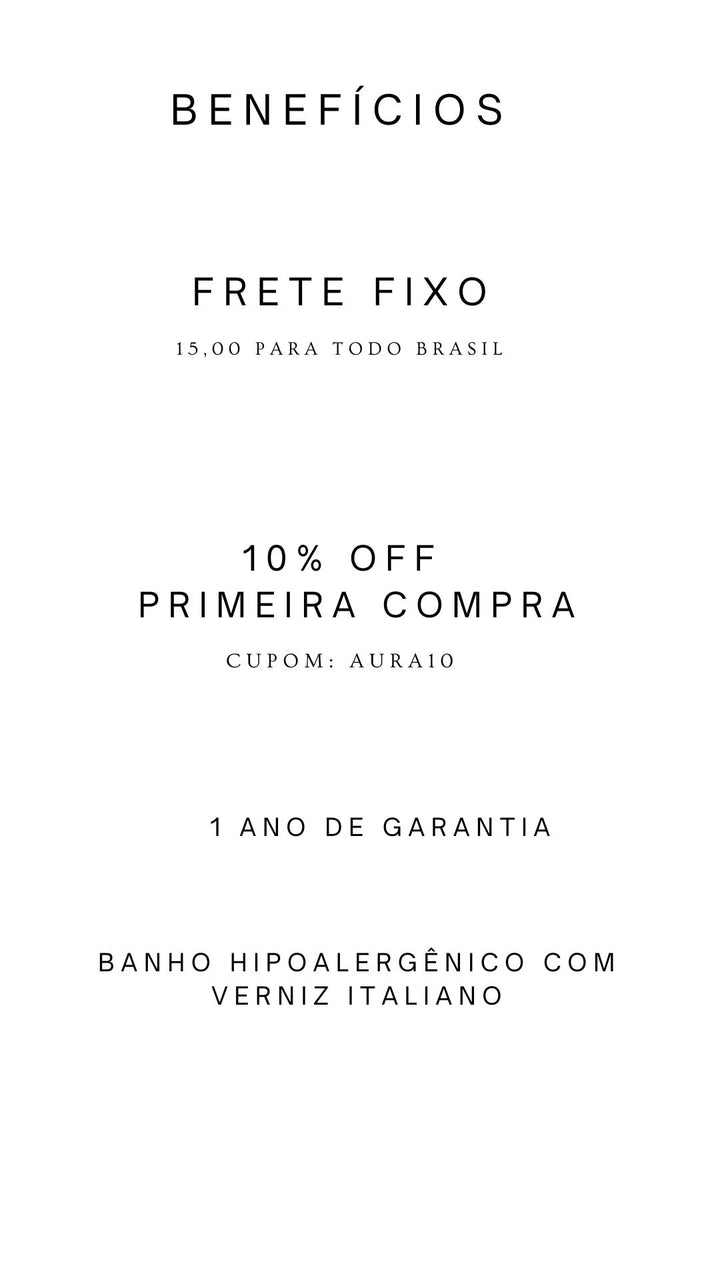 • Banho hipoalergênico com verniz italiano; livre de níquel; 1 ano de garantia — para você usar com confiança.